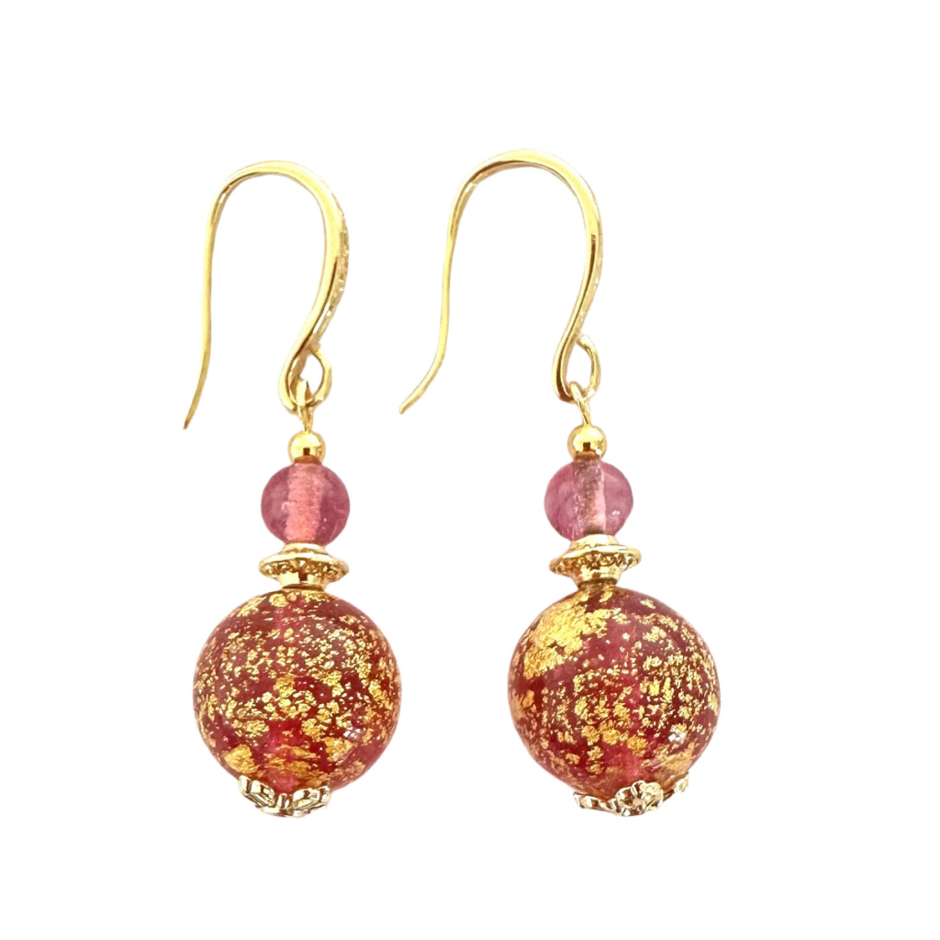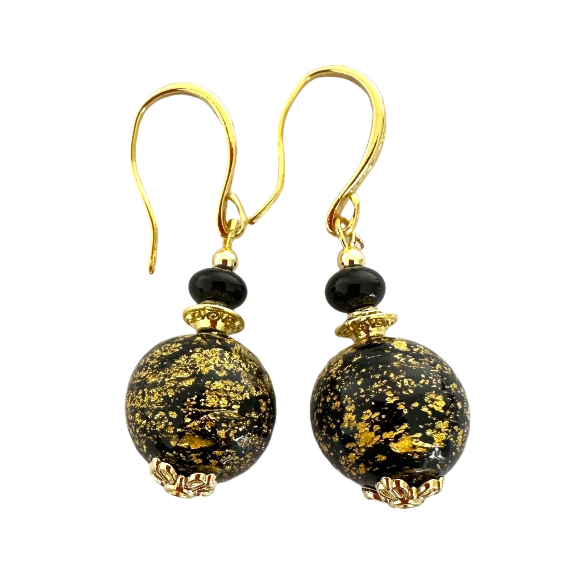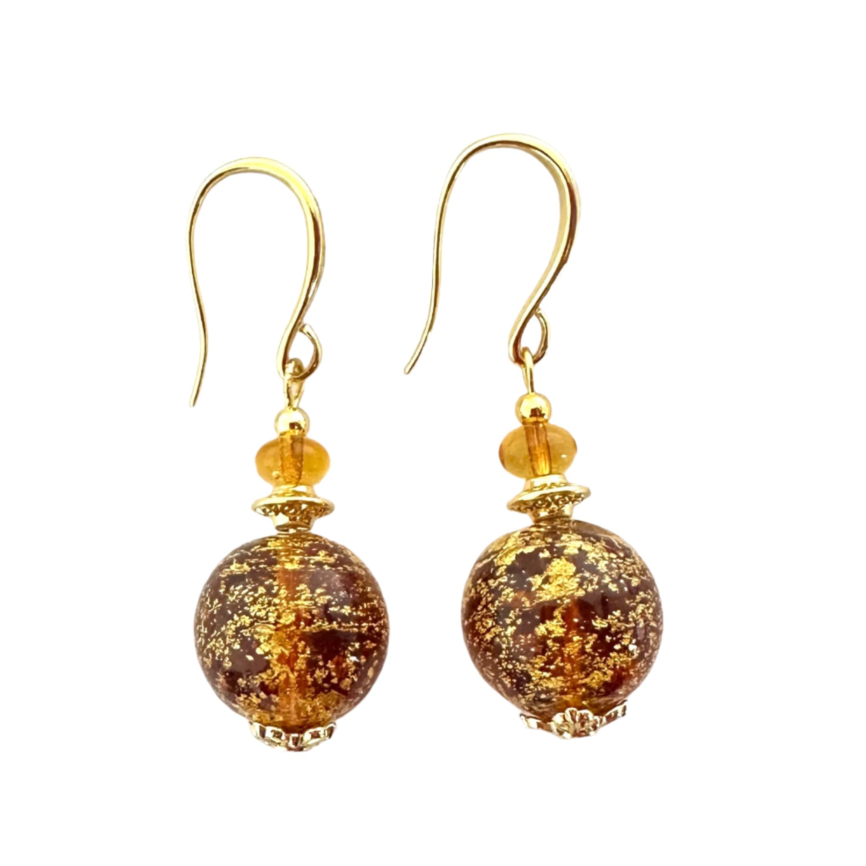 These classy earrings are always popular with sumptuous Murano glass and gold elevating any outfit. They are made from ca'd'oro (cracked gold) beads where gold foil is applied in a very fine layer. Matcvhed with a tiny Murano glass rondelle and gold-plated findings for a stunning look.