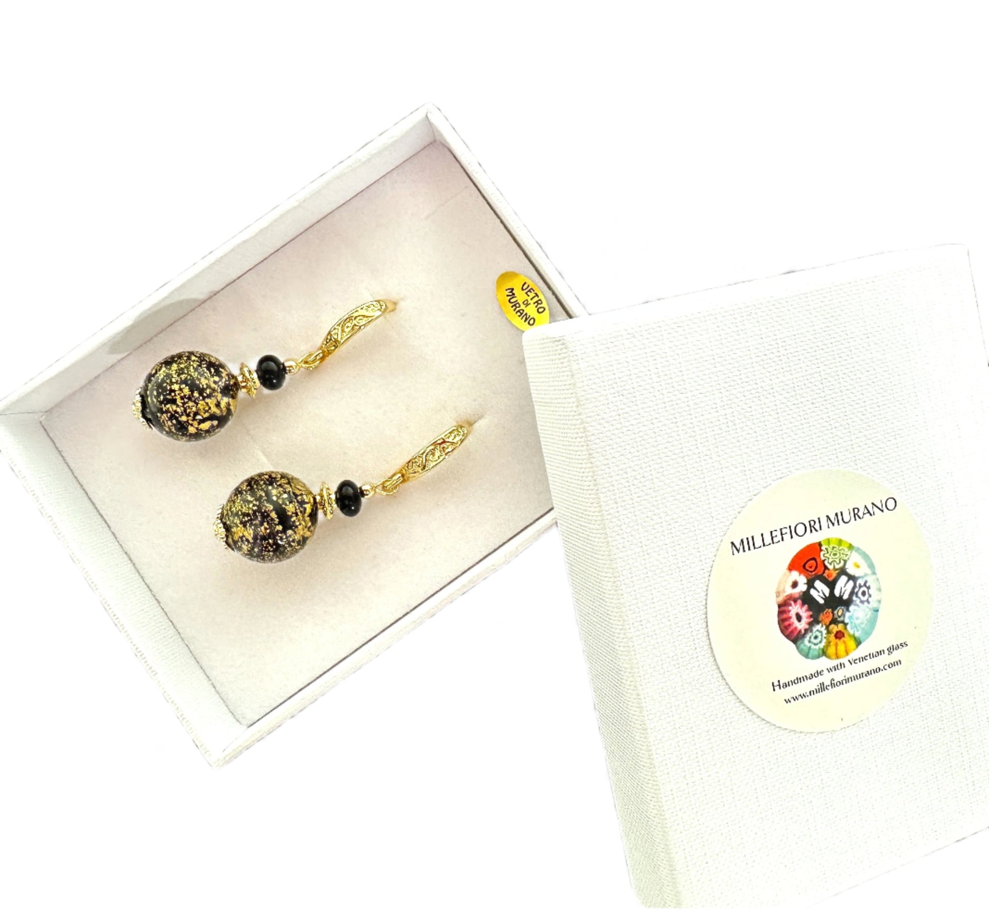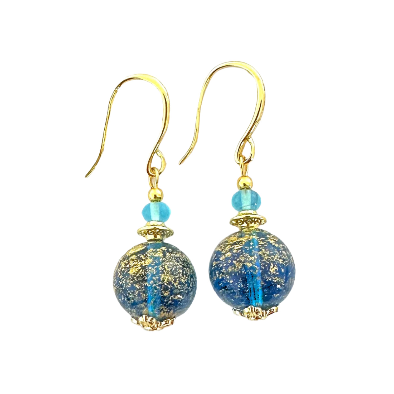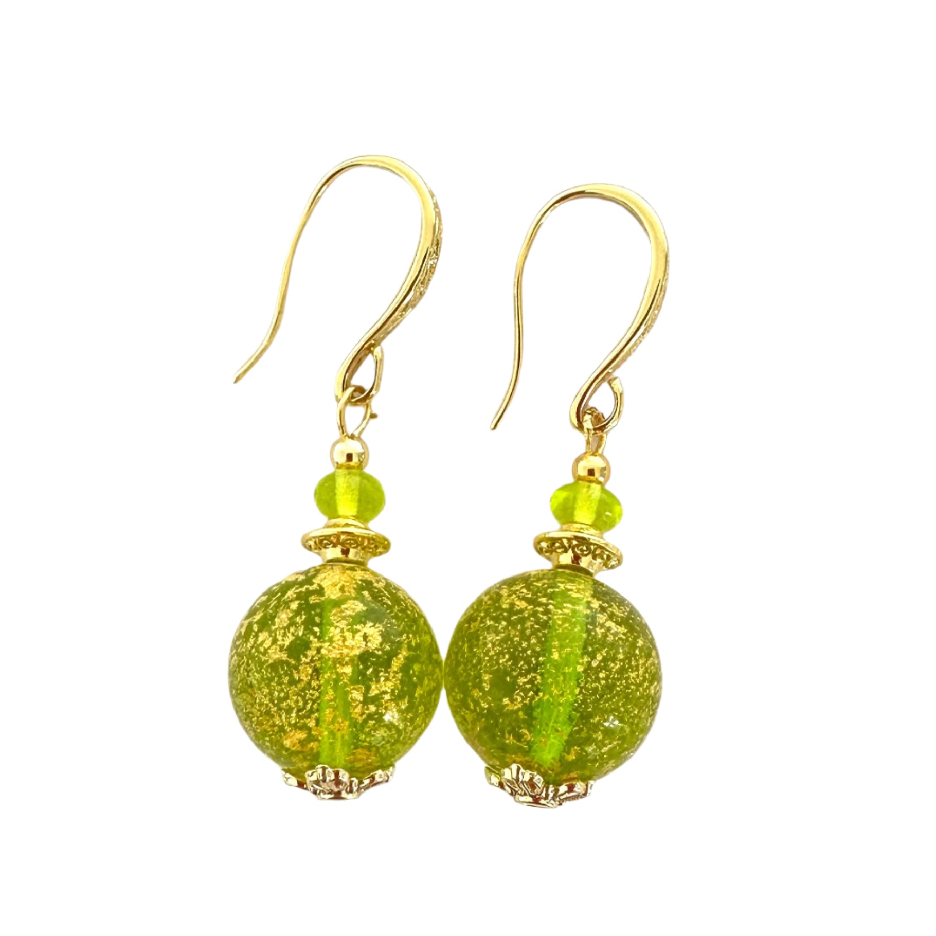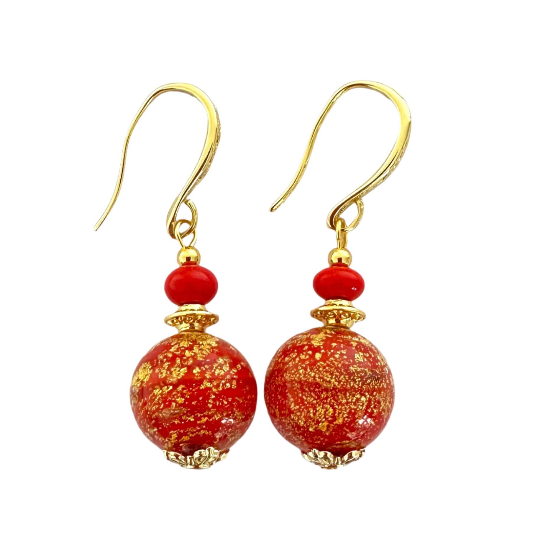 These classy earrings are always popular with sumptuous Murano glass and gold elevating any outfit. They are made from ca'd'oro (cracked gold) beads where gold foil is applied in a very fine layer. Matcvhed with a tiny Murano glass rondelle and gold-plated findings for a stunning look.