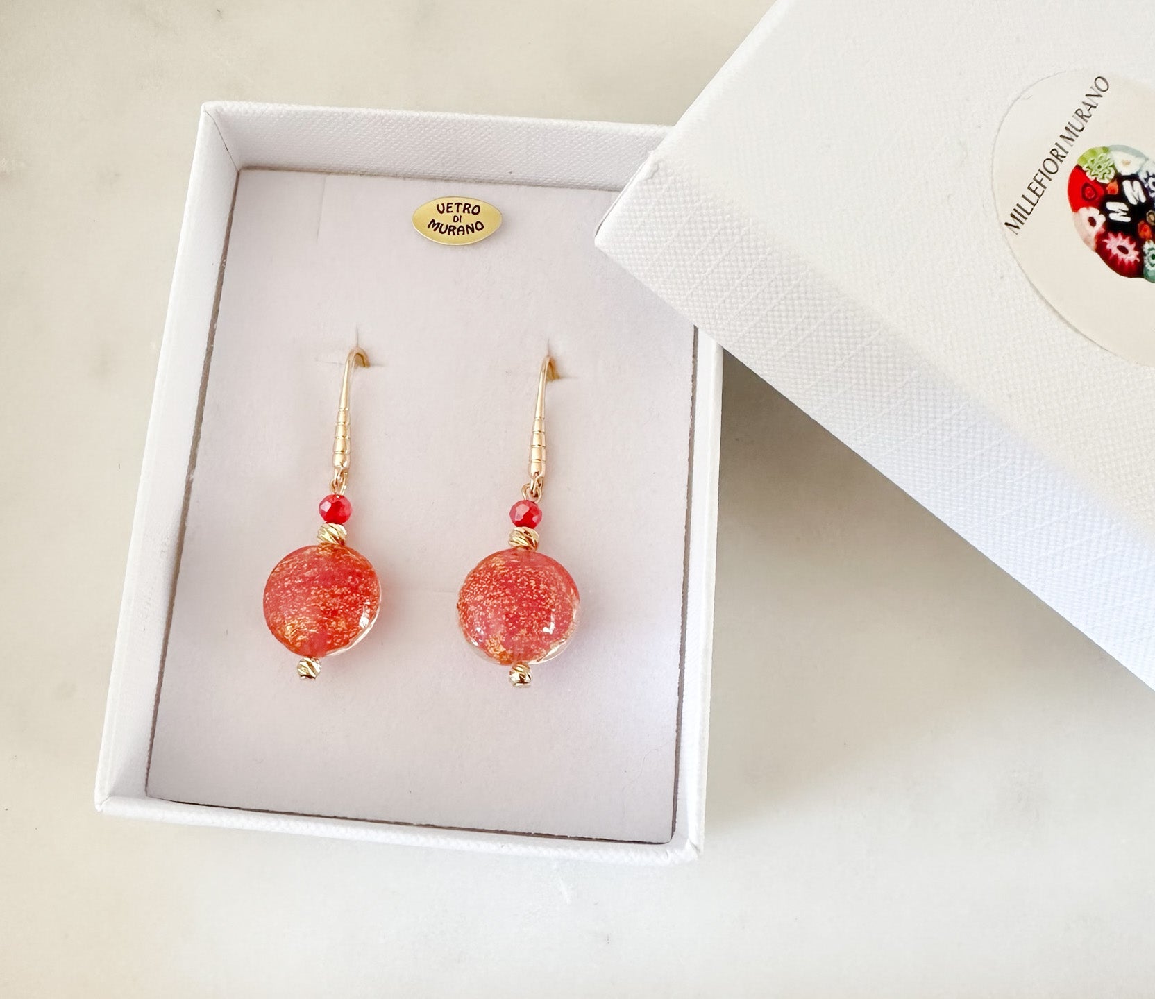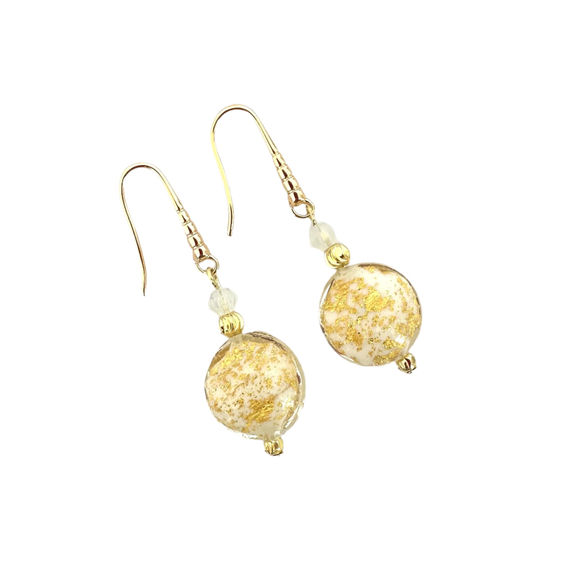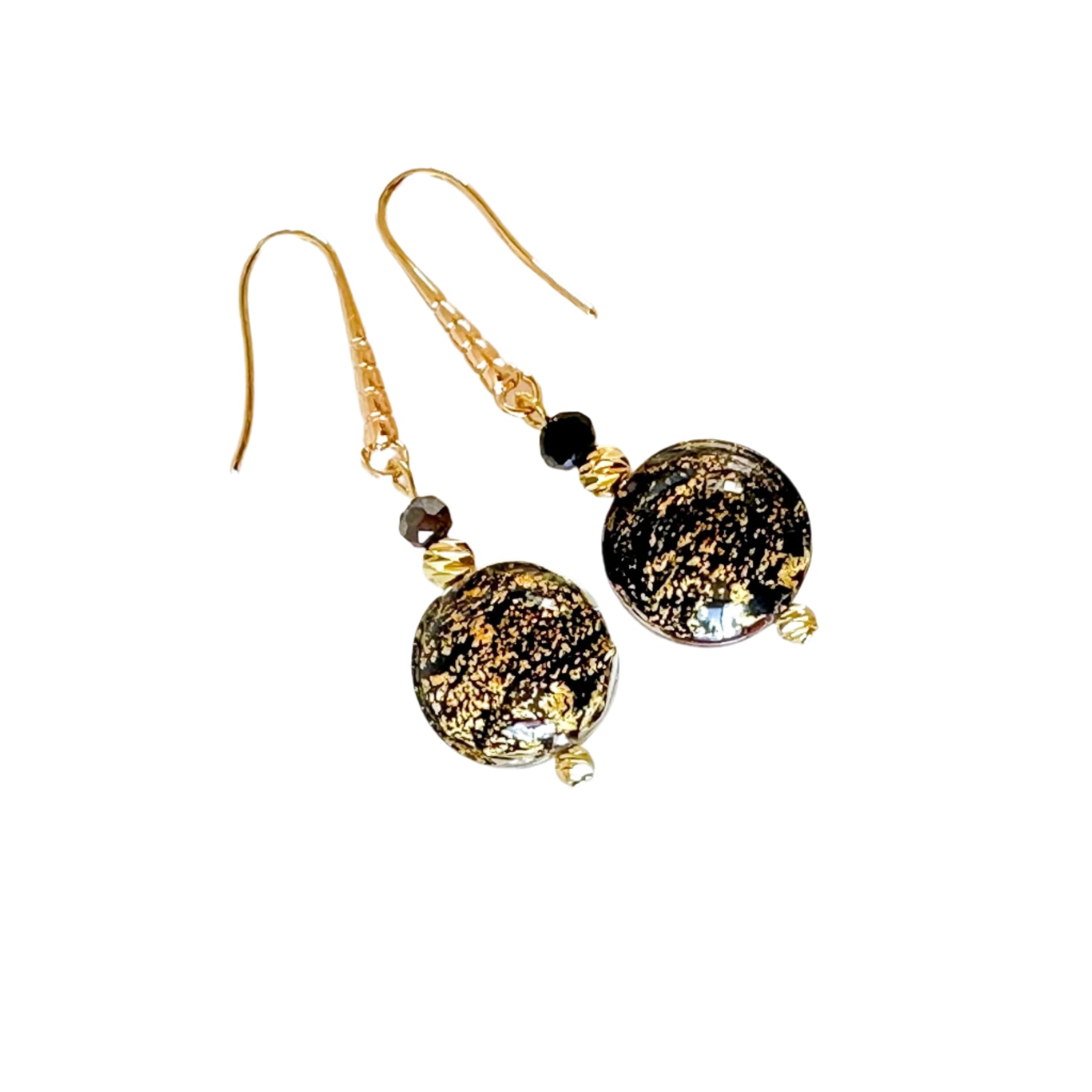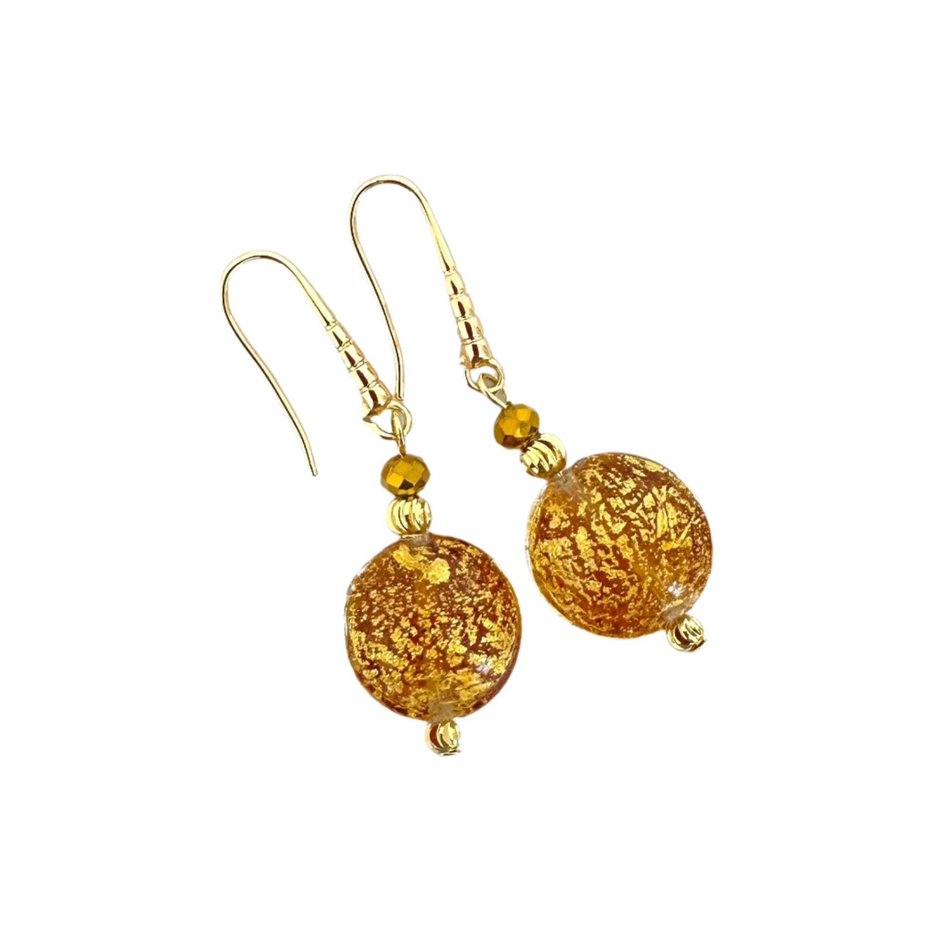 These classy earrings are always popular with sumptuous Murano glass and gold elevating any outfit. They are made from ca'd'oro (cracked gold) beads where white or yellow gold is applied in a very fine layer over the top of the coloured Murano glass, giving them a speckled (chiazza) look.