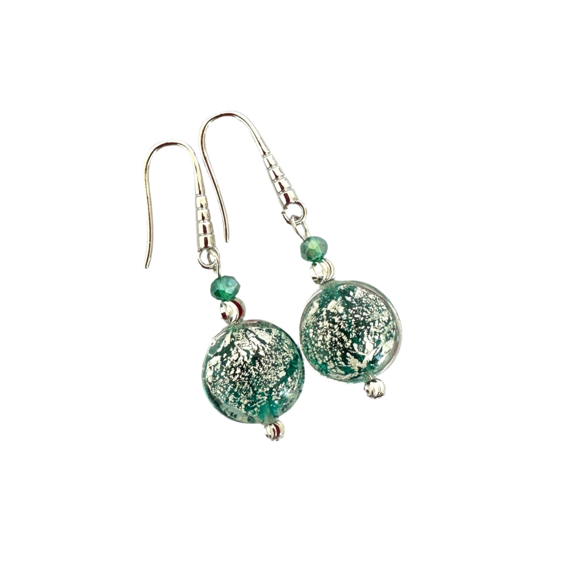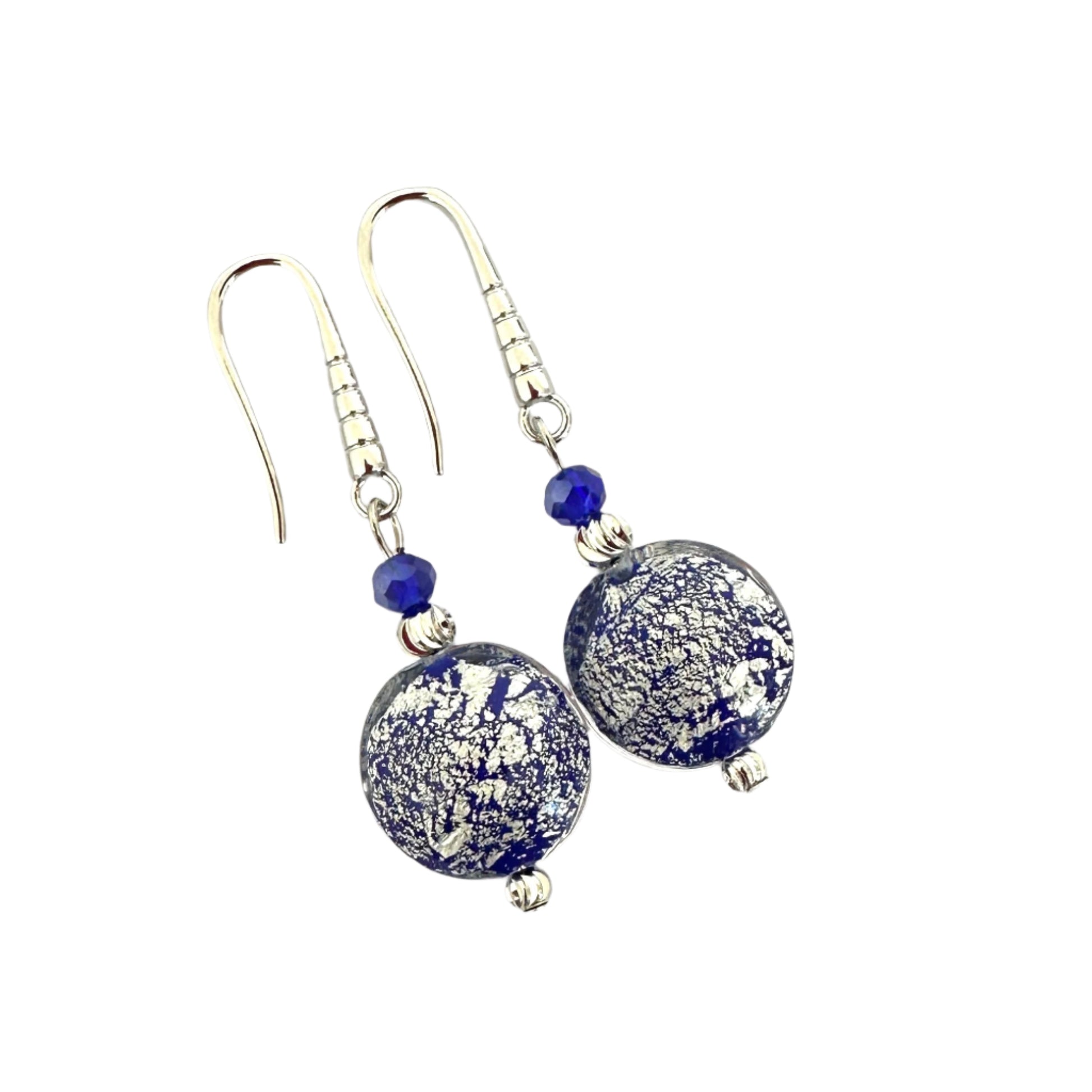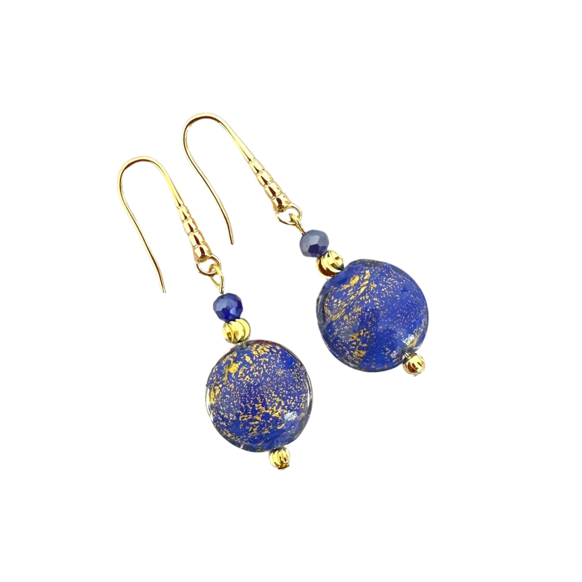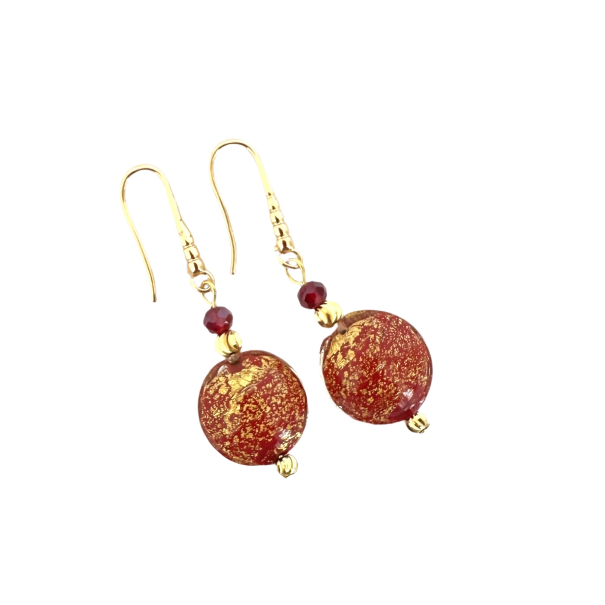 These classy earrings are always popular with sumptuous Murano glass and gold elevating any outfit. They are made from ca'd'oro (cracked gold) beads where white or yellow gold is applied in a very fine layer over the top of the coloured Murano glass, giving them a speckled (chiazza) look.