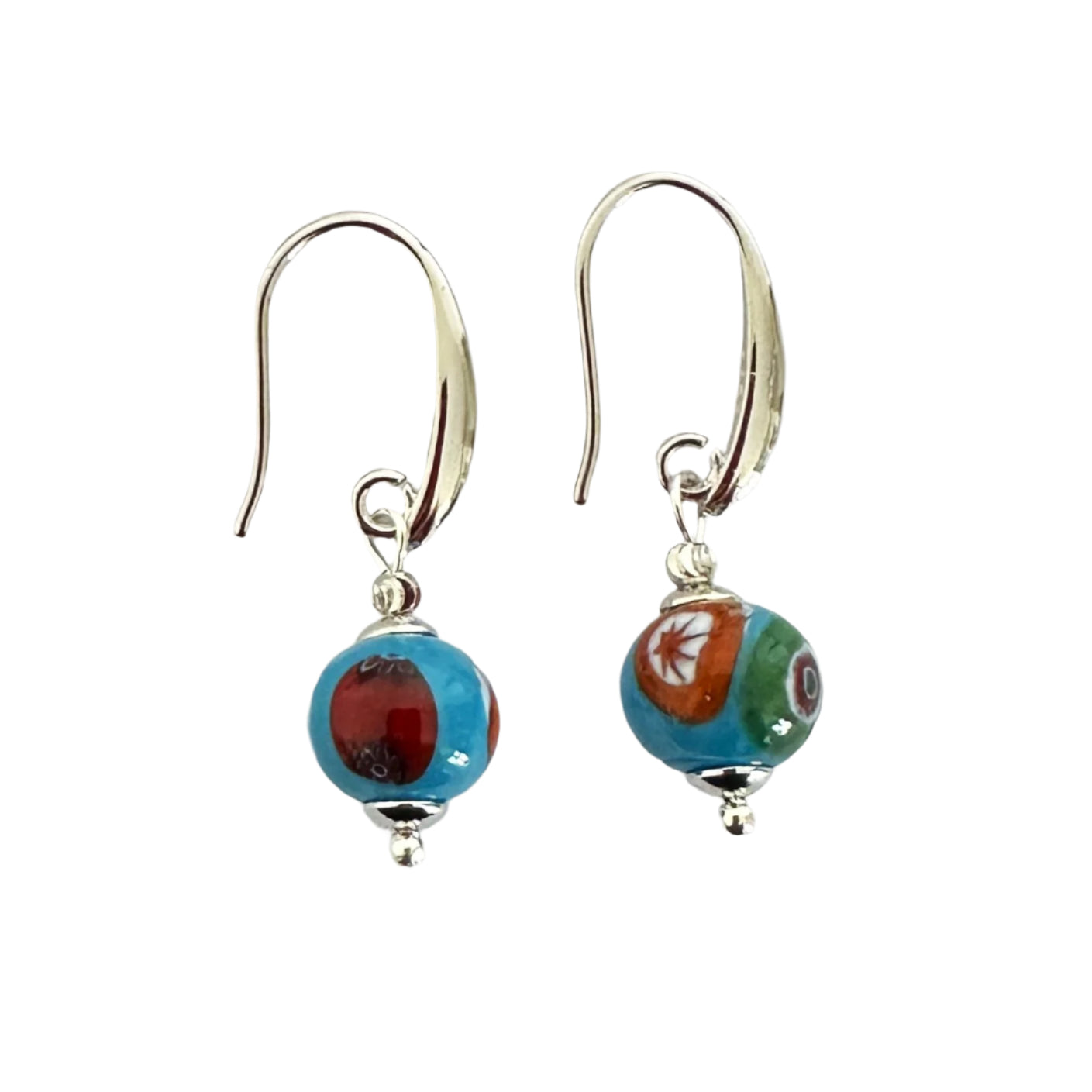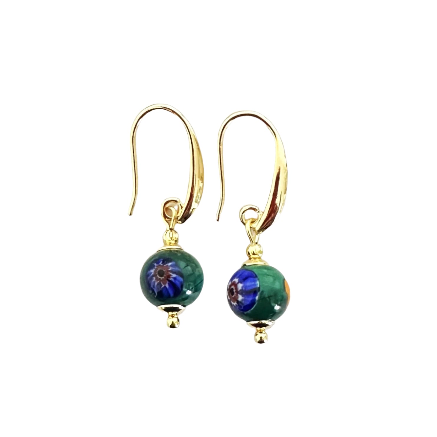 These Millefiori earrings are handmade in Australia with traditional beads with millefiori fused into colored Murano glass. Gold and platinum plated findings add elegance to these instantly recognisable Venetian treasures.